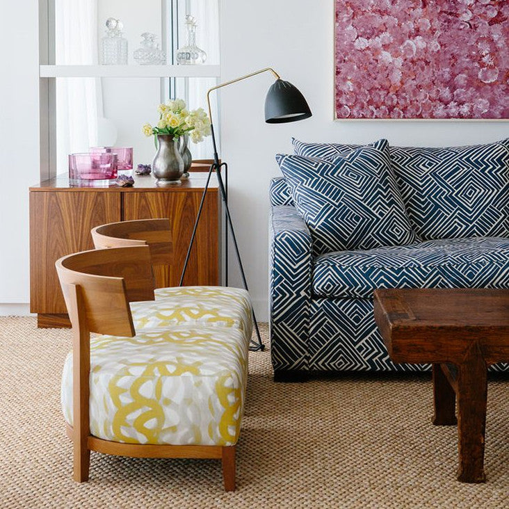New Shrimp on Tint takes the same uncompromising geometry and asks: what if it laughed? The warm coral-red on cream ground gives the pattern an earthiness that plays beautifully with rattan, with natural wood, with rooms that get actual sunlight and aren't embarrassed about it.