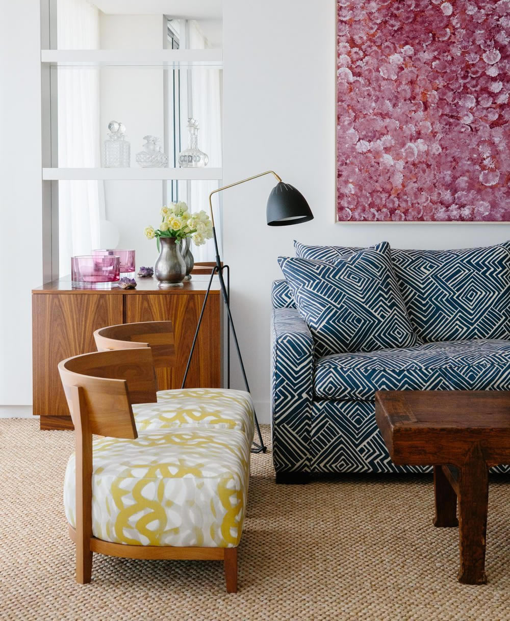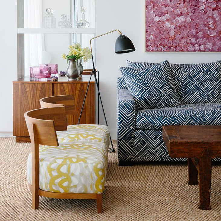 The Cstom Navy sits deep and confident on the warm ground, reading almost as a neutral from a distance but revealing its full maze up close. It earns trust before it earns attention.