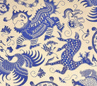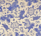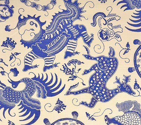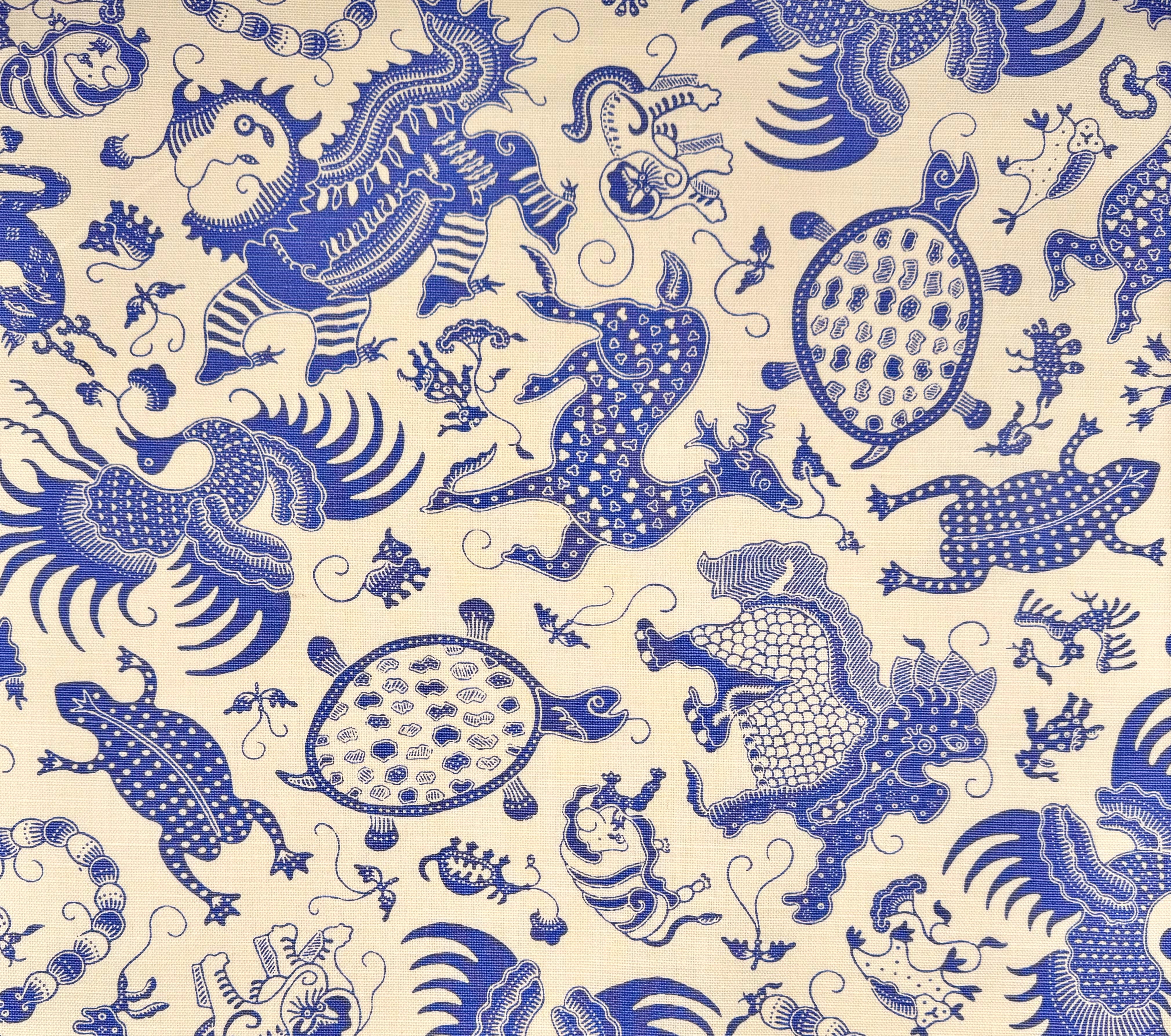 Whimsical Chinoiserie print with Chinese zodiac animals. Dragons, snakes, birds, deer, turtles, etc. A China Seas classic.