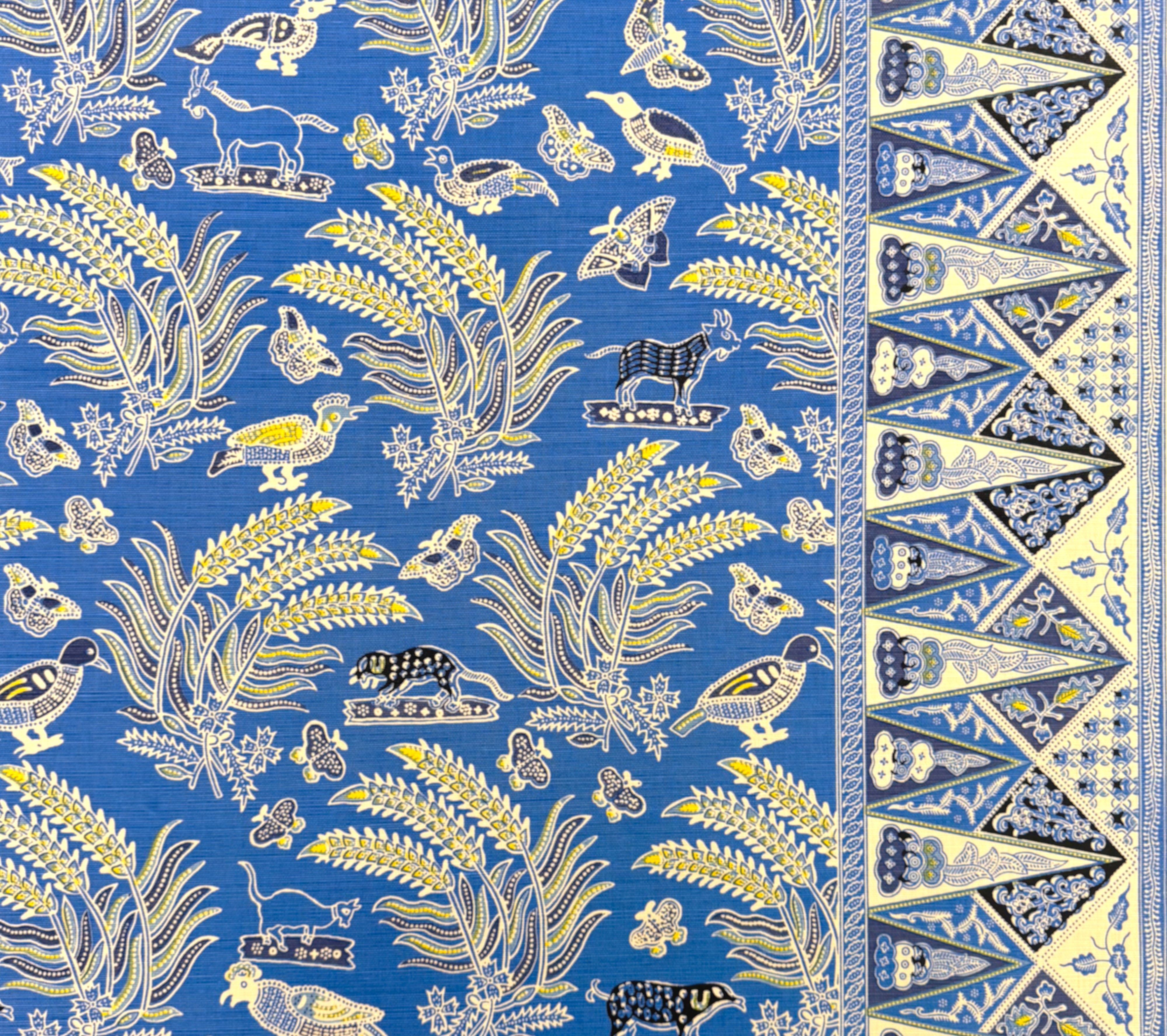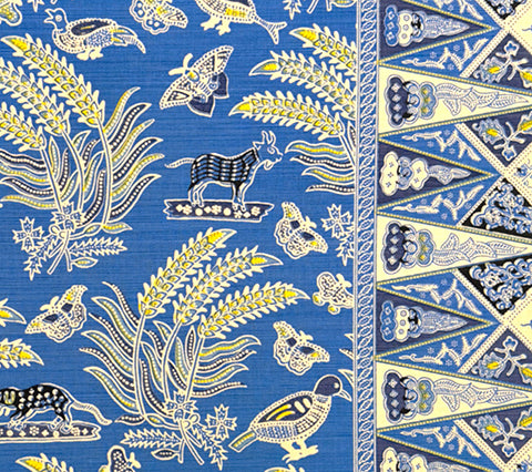 China Seas Fabric: Malay Batik - Custom French Blue / Multi on Tinted Belgian Linen / Cotton