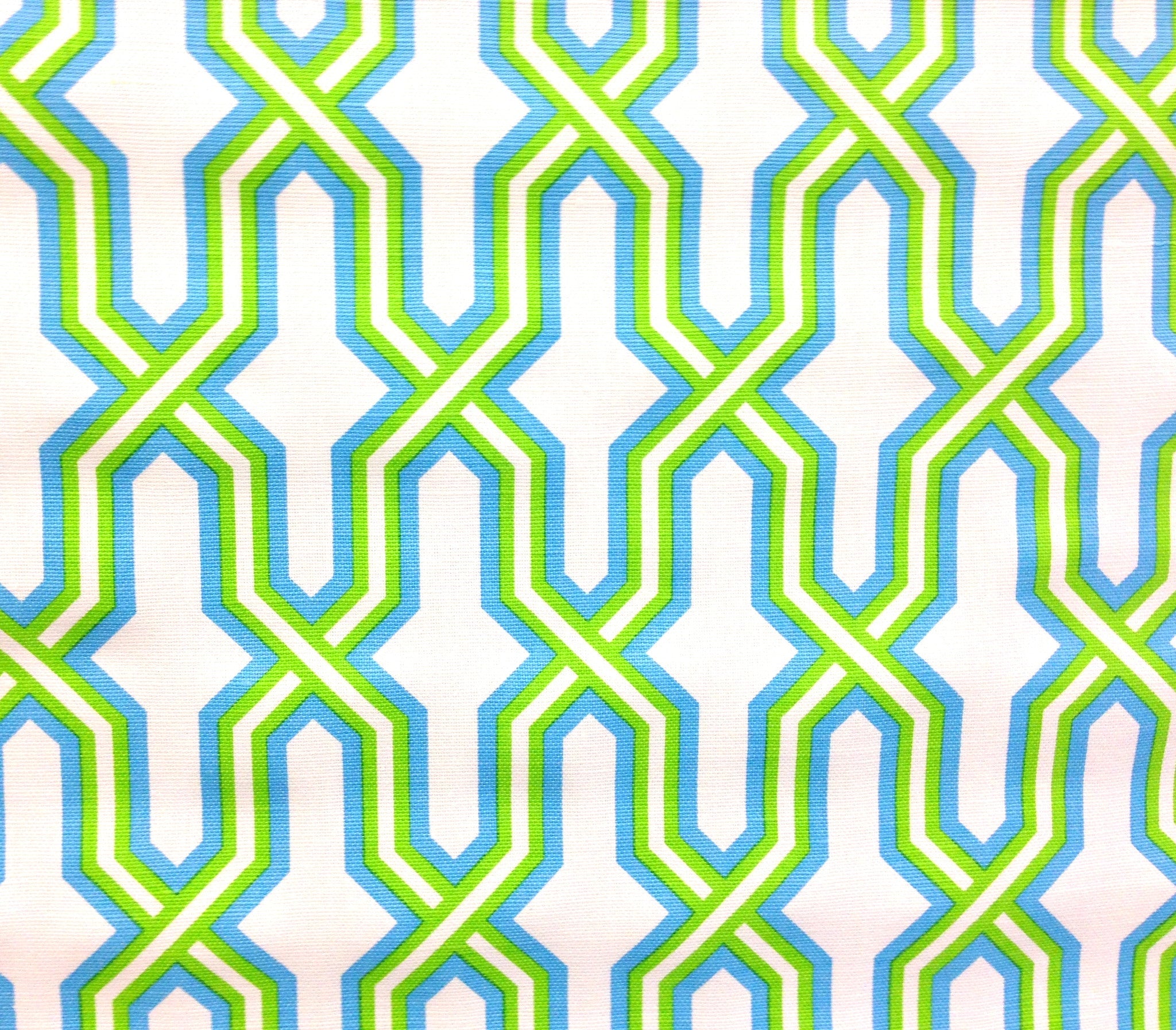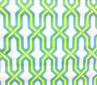 China Seas Fabric: Gorrivan Fretwork - Custom Grass Green / Sky Blue on White Belgian Linen / Cotton