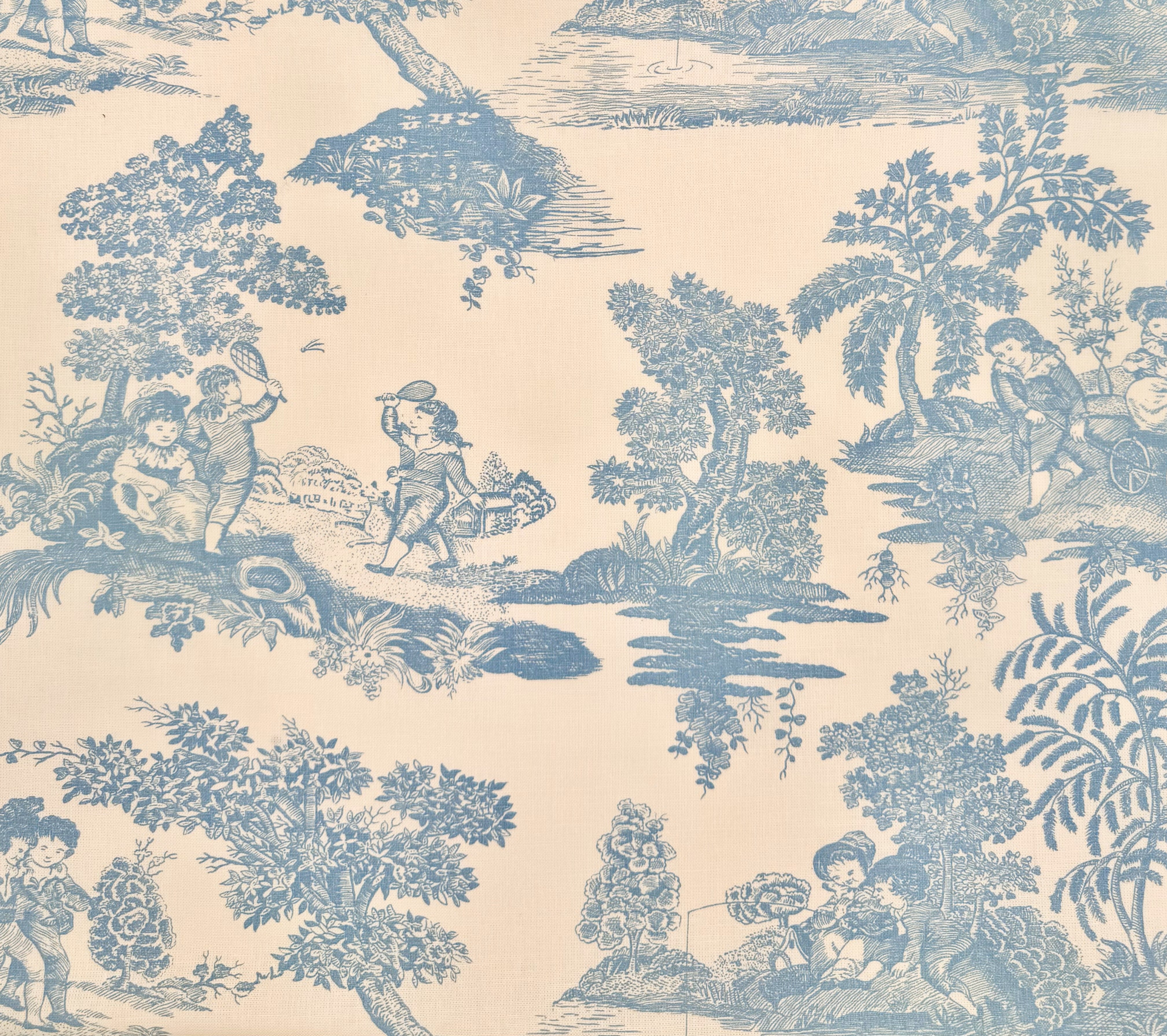 Quadrille Fabric: Les Enfants Engraving- French Blue on Tinted Belgian Linen / Cotton