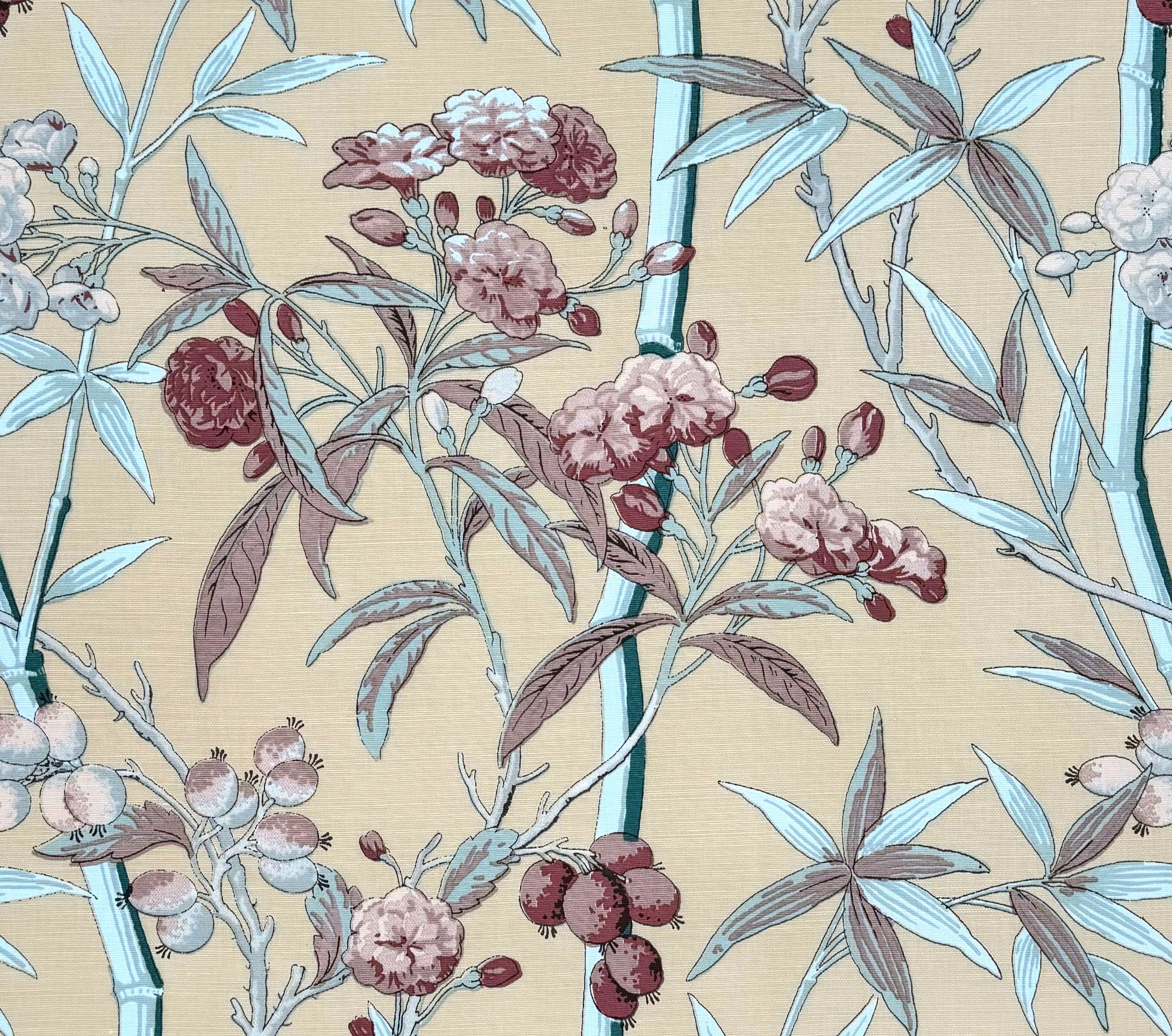 Quadrille Fabric: Enchanted Garden Bamboo - Reds / Silver / Green on Beige Linen / Cotton