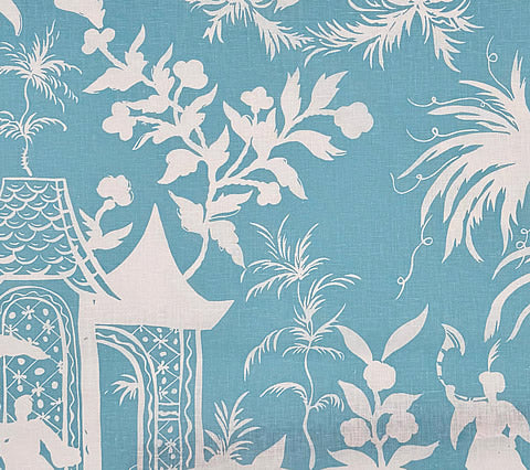 The classic China Seas Chinoiserie print with pagodas, palm trees, flowers, and figures. A timeless bestseller.