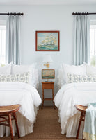 This turquoise on tinted linen has the particular blue of swimming pools glimpsed through garden gates in towns where the shops close at noon and no one apologizes. It is the color of being unavailable. Of sand still in the binding of a paperback novel. Of the third week of August, when even the light seems to be on holiday. Pair it with sailing ship paintings and rattan, or don't—it will find its own way to the coast.