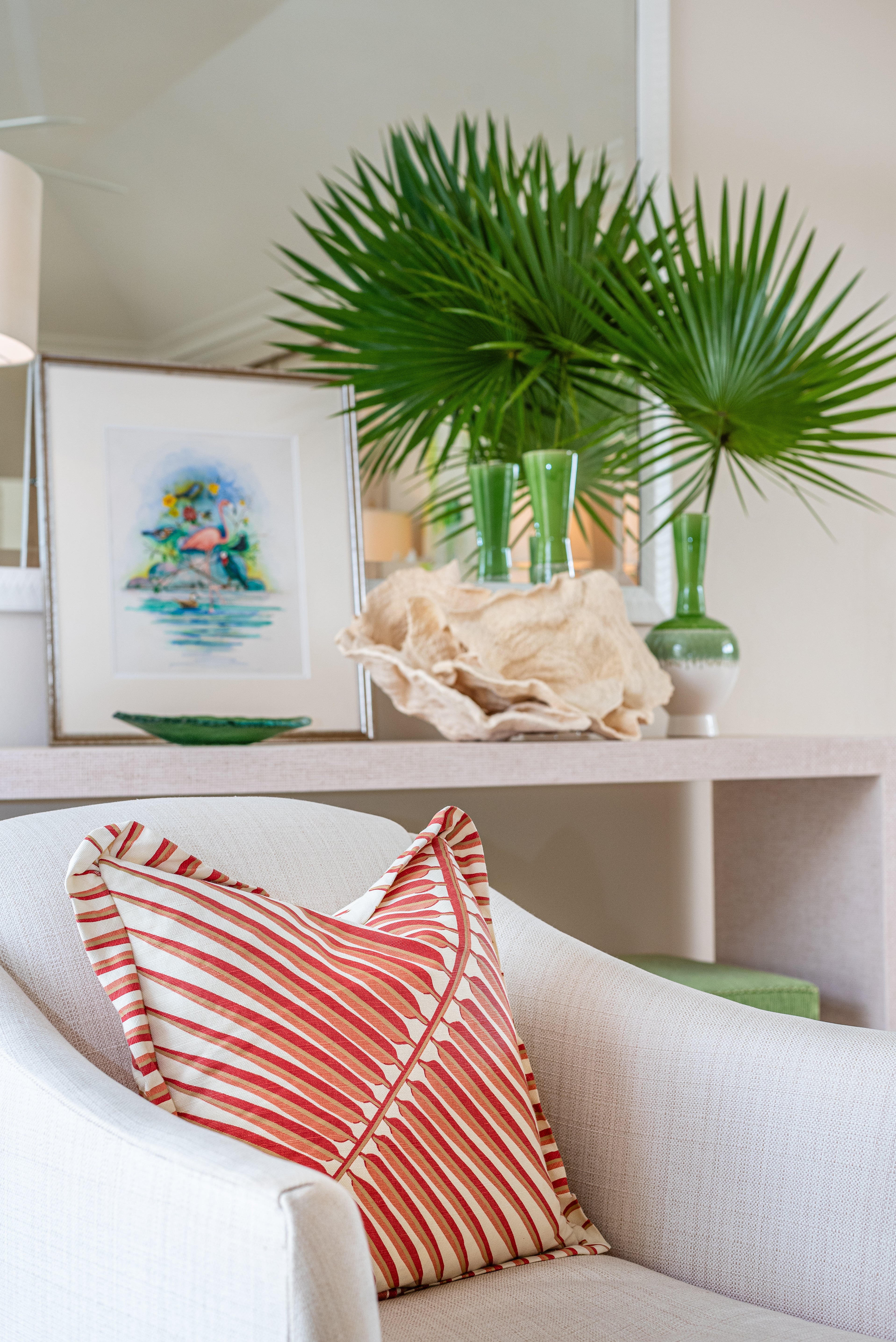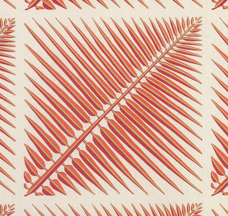 This terracotta on oyster carries the warmth of a Mediterranean afternoon - sun-baked clay, bleached linen, the color of old roof tiles seen from a distance. At 21 yards, there's enough here for a serious gesture: curtains that frame a view and become part of it, pillows that anchor a conversation. The rare palm that's equally at home in a Florida great room or a London townhouse - it doesn't care about your latitude, only your nerve.