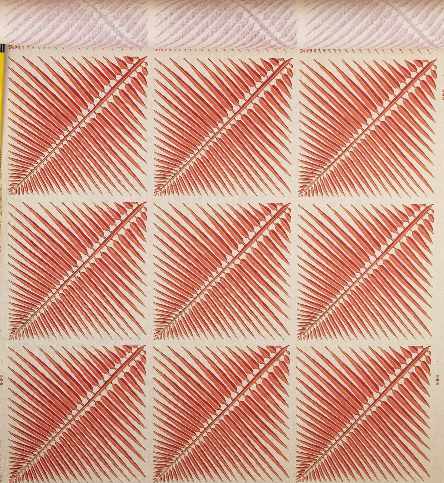 The fronds don't drape - they diagonal, slicing across the repeat with the confidence of a surveyor's line through uncharted territory. Each leaf is a study in parallel precision: spine, blade, spine, blade, the rhythm of something that grows with intention. Part botanical illustration, part Art Deco fever dream, entirely committed to its own logic.