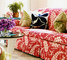 Lighting on first photo used flash - second smaller photo shows the item more accurately.  This is the fabric used on the sofa in the third photo.