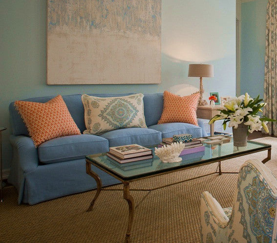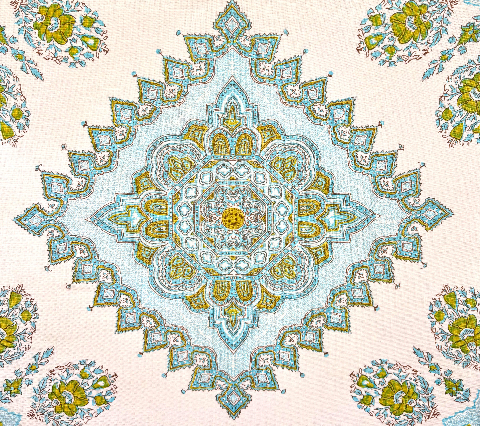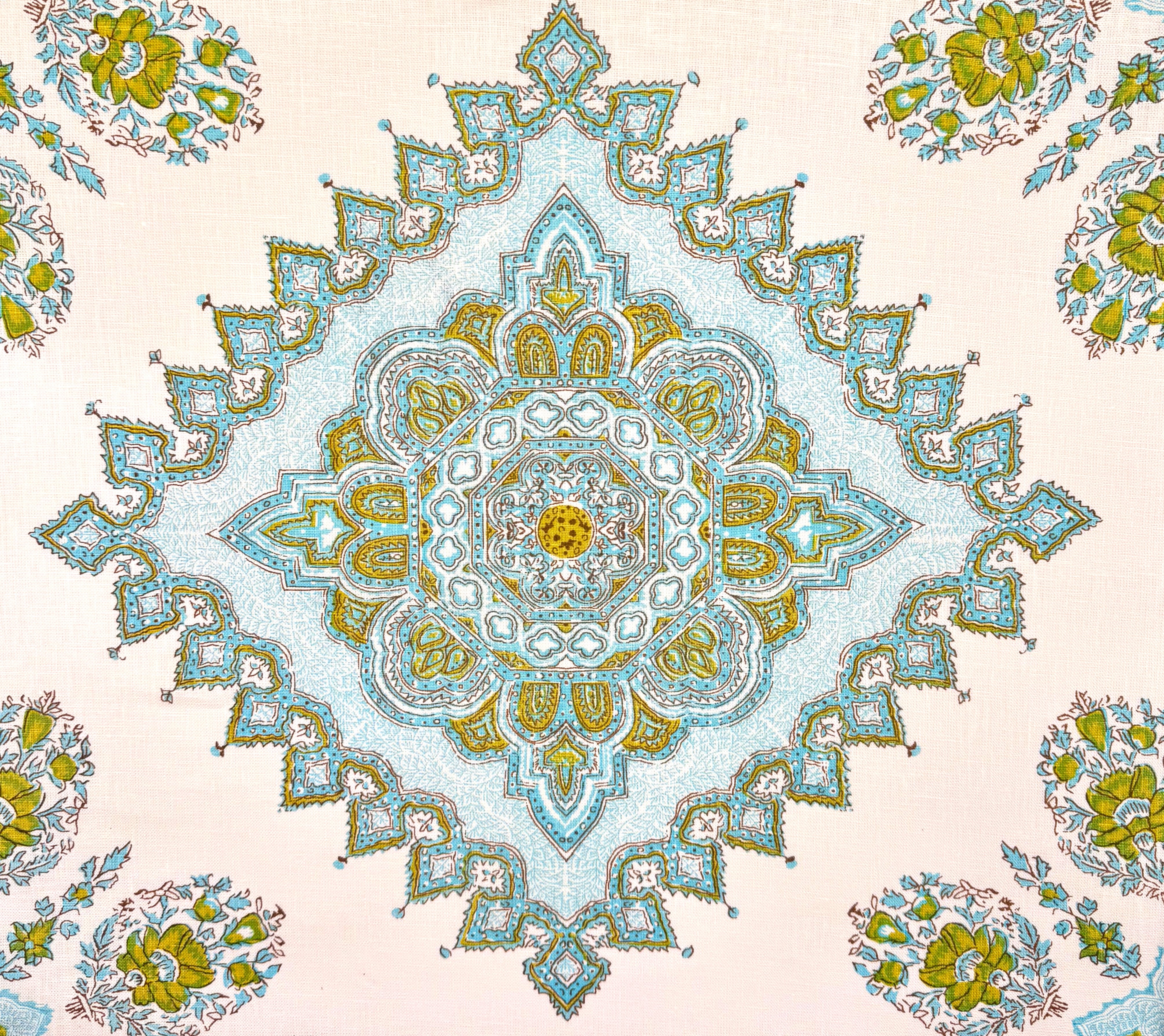 Home Couture Fabric: Persepolis - Custom Turquoise / Tobacco / Green on White Linen