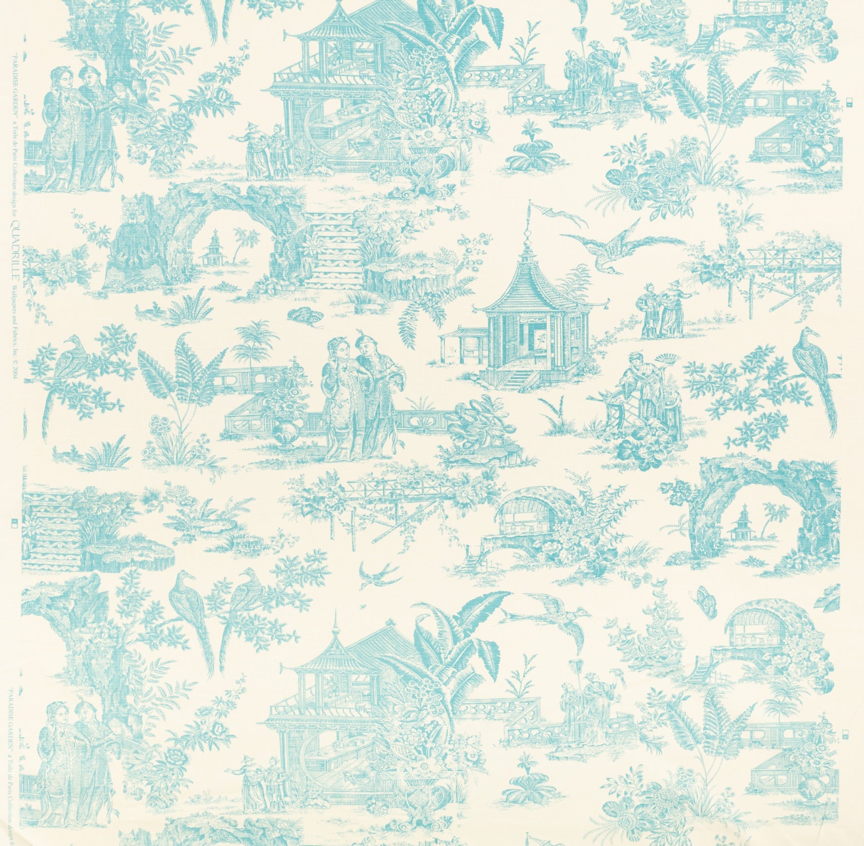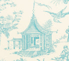 The classic Chinoiserie print from Quadrille, featuring temples, palm trees, and peacocks.