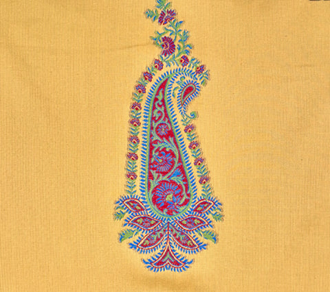 Multi on Gold – jewel-tone pink, violet, turquoise, and lime paisleys embroidered on a warm golden ground.