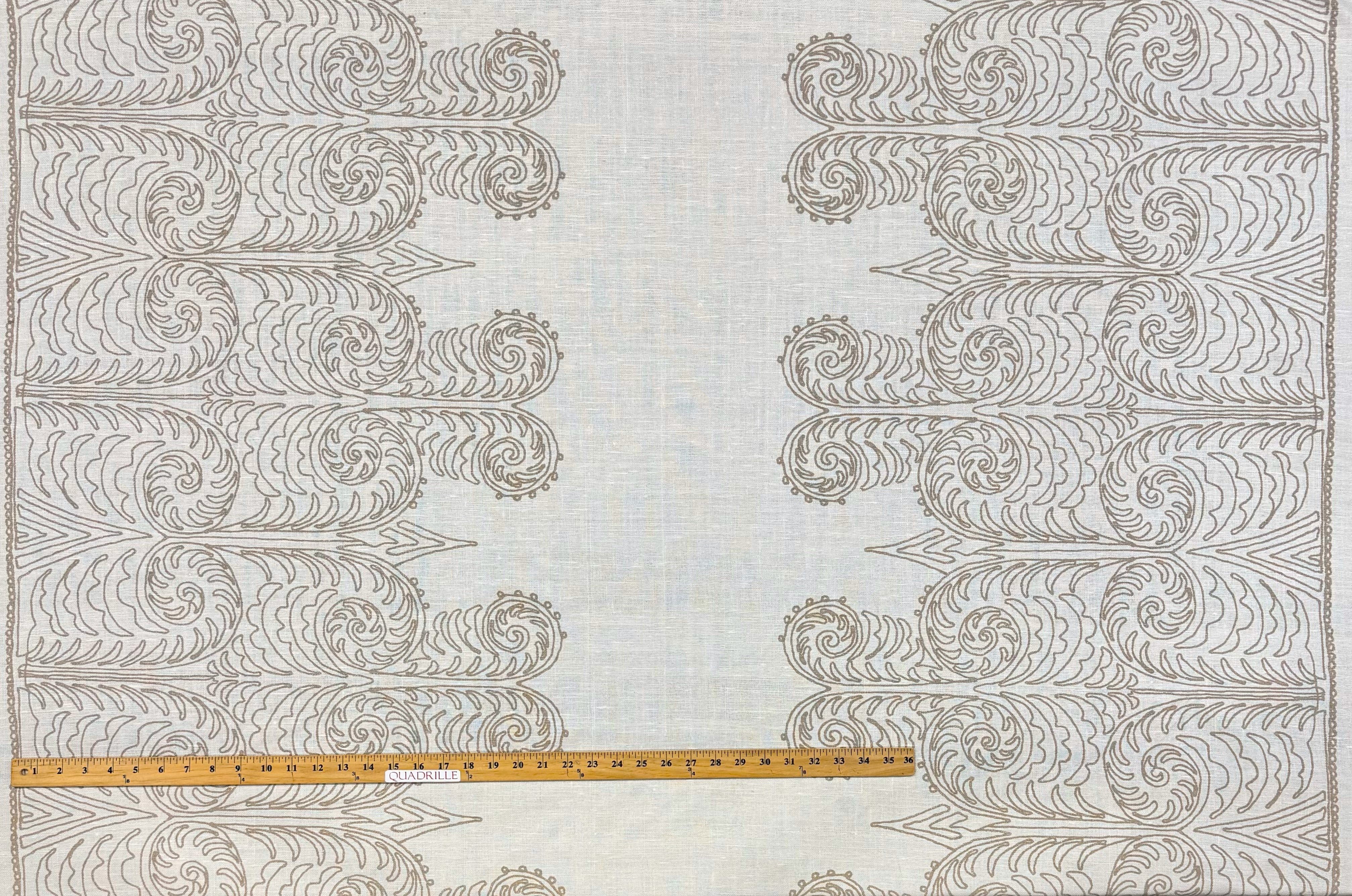 Almost never available in the outlet, Gypsy Dance is a true custom, in that the screens can be laid anywhere on the table to get the spacing the designer wants. In this case, only the left side of this fabric has a print. See second photo for full pattern repeat.
