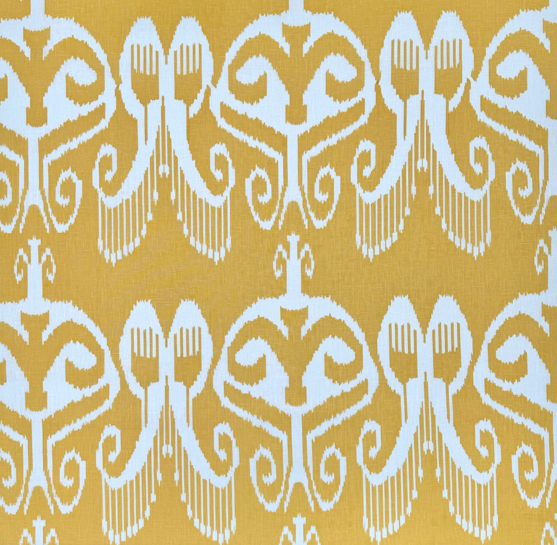 A striking, large-scale, ikat print, here in a soft buttery yellow. A classic from China Seas.