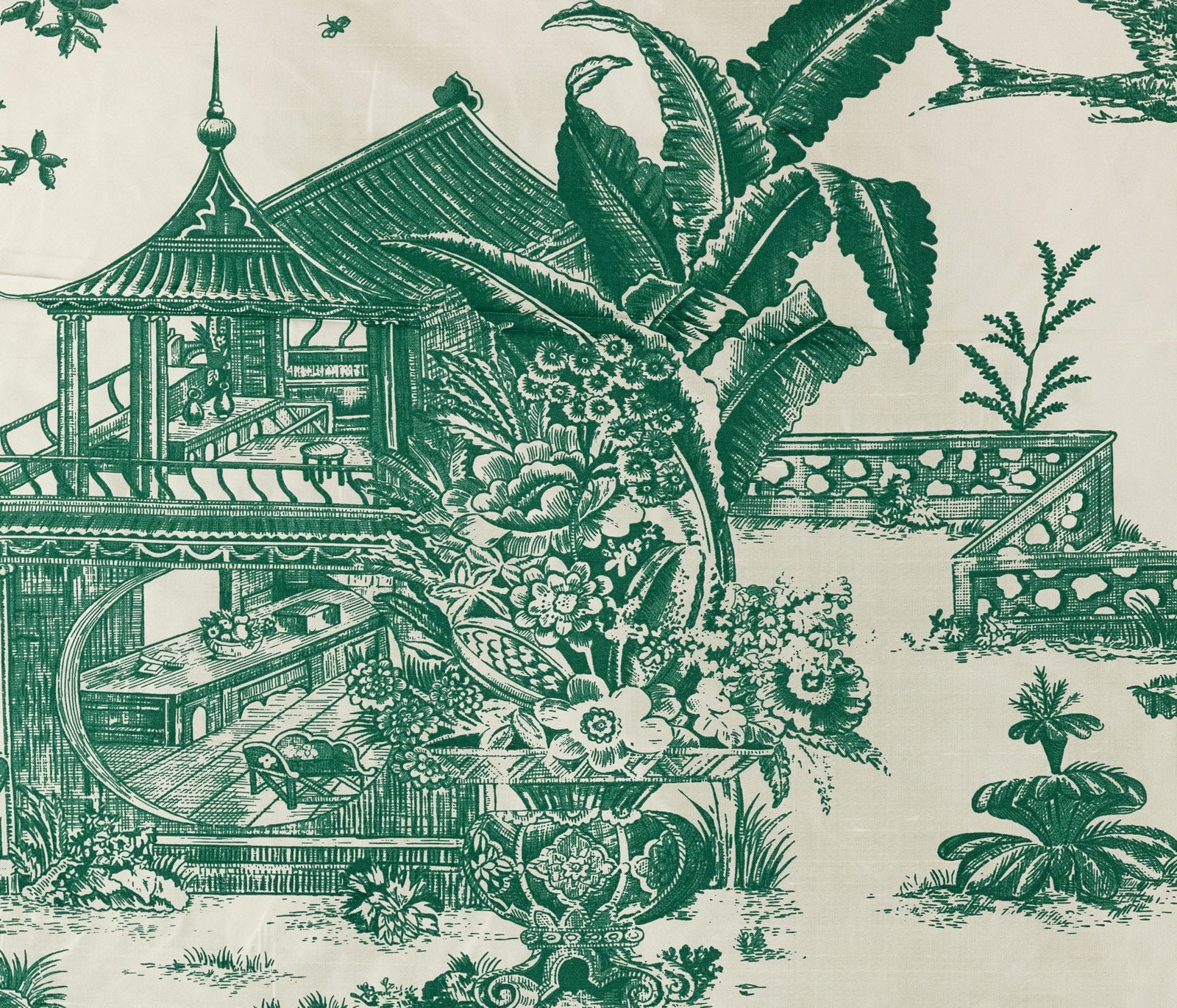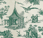 The classic Chinoiserie print from Quadrille, featuring temples, palm trees, and peacocks.